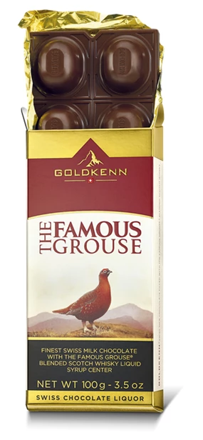 FAMOUS GROUSE WHISKY LIQUOR BAR, Fine combination between FAMOUS GROUSE WHISKY & a fine Swiss Milk Chocolate, Swiss Milk Chocolate (37% cocoa) filled with JACK DANIEL’S® TENNESSEE HONEY.